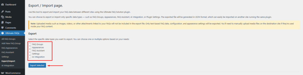 Note: Uploaded media such as images, videos, or other attachments linked to your FAQs will not be included in the export file. Only text-based FAQ data, configuration, and appearance settings will be exported. You’ll need to manually upload media files on the destination site if they’re used inside your FAQ content.
