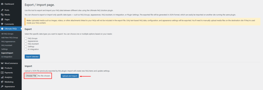 You can choose to export specific data types — such as FAQ Groups, Appearances, FAQ Assistant, AI Integration or Plugin Settings. On the Import section upload your Downloaded.json file and simply click Upload and Import Button.